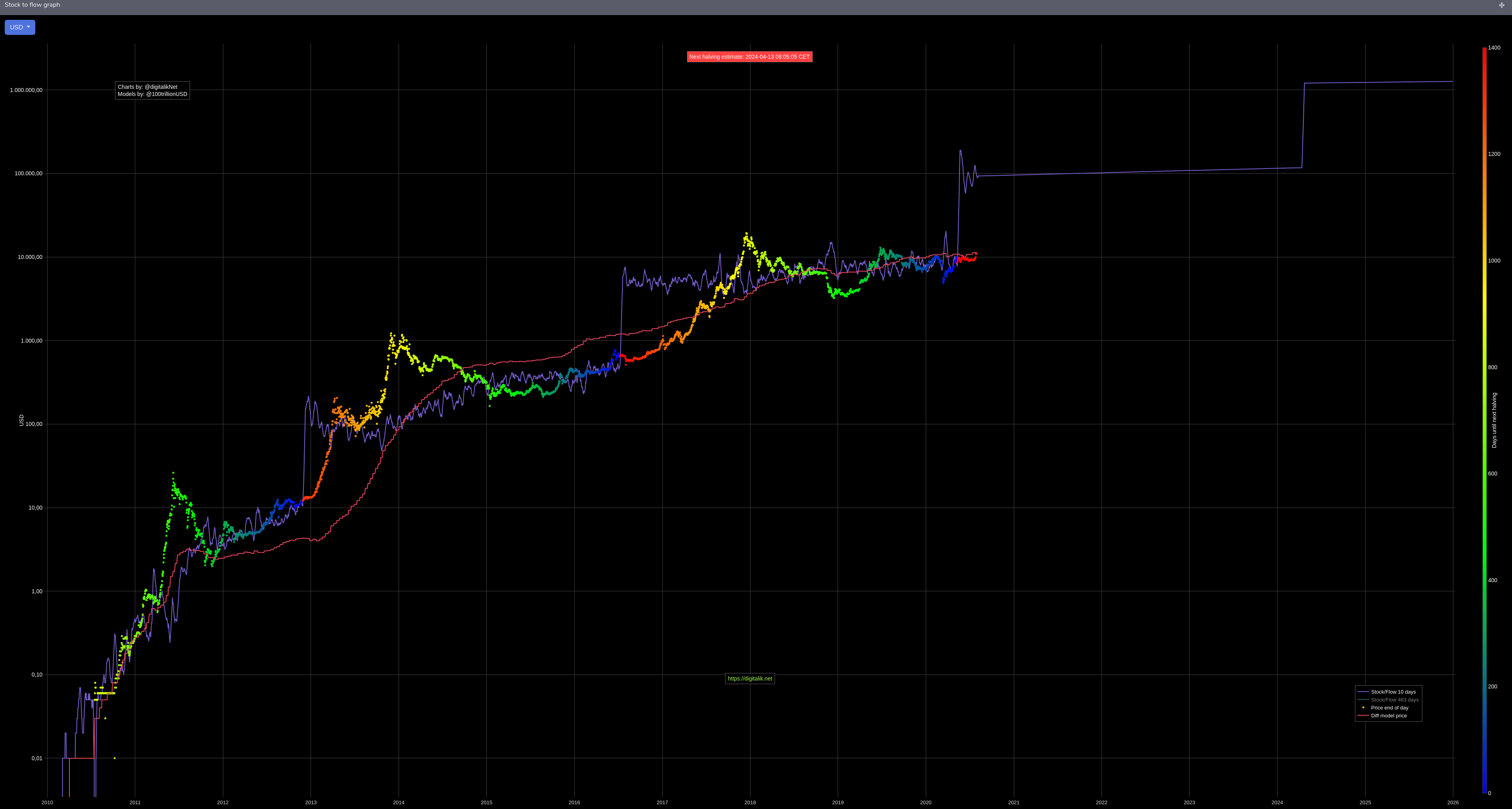 By default, this platform displays the often cited stock-to-flow (abbrievated as s2f) model for Bitcoin, which is linked to the halving events for this cryptocurrency.