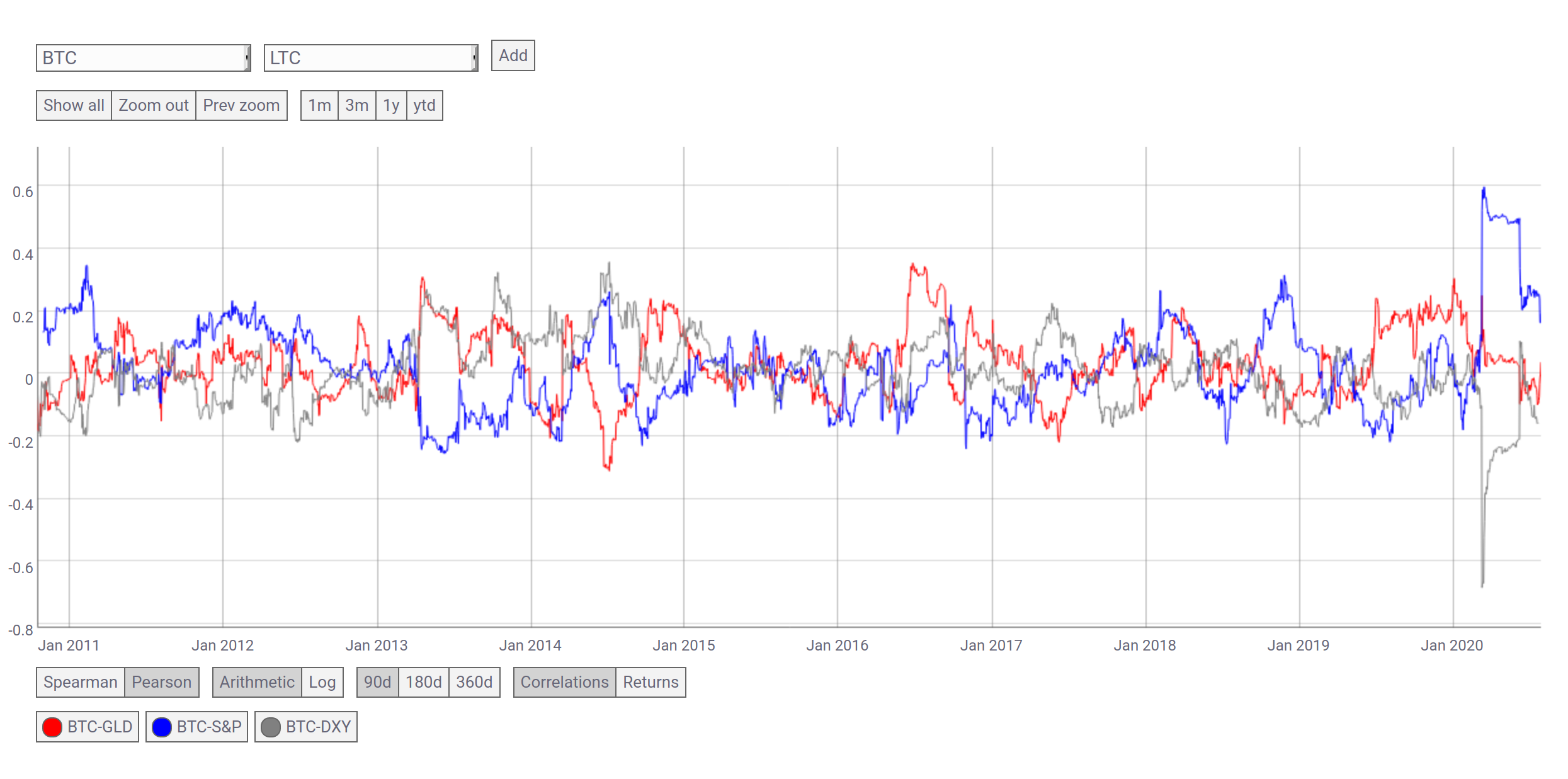 Correlation charts by Coinmetrics.io (publicly, there is only 90d ma smoothing available, unfortunately; less time would have been far more accurate resp. timely).
