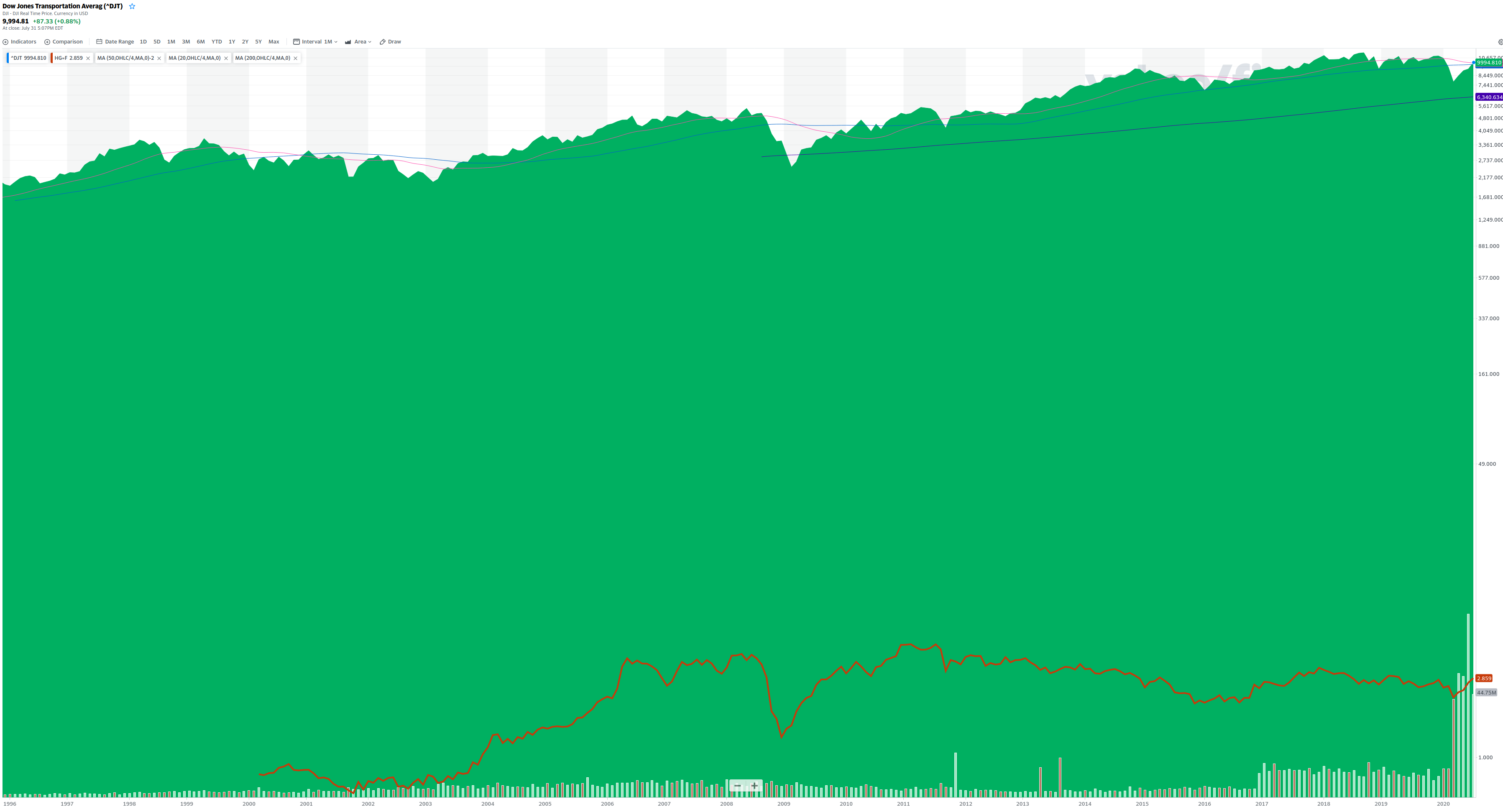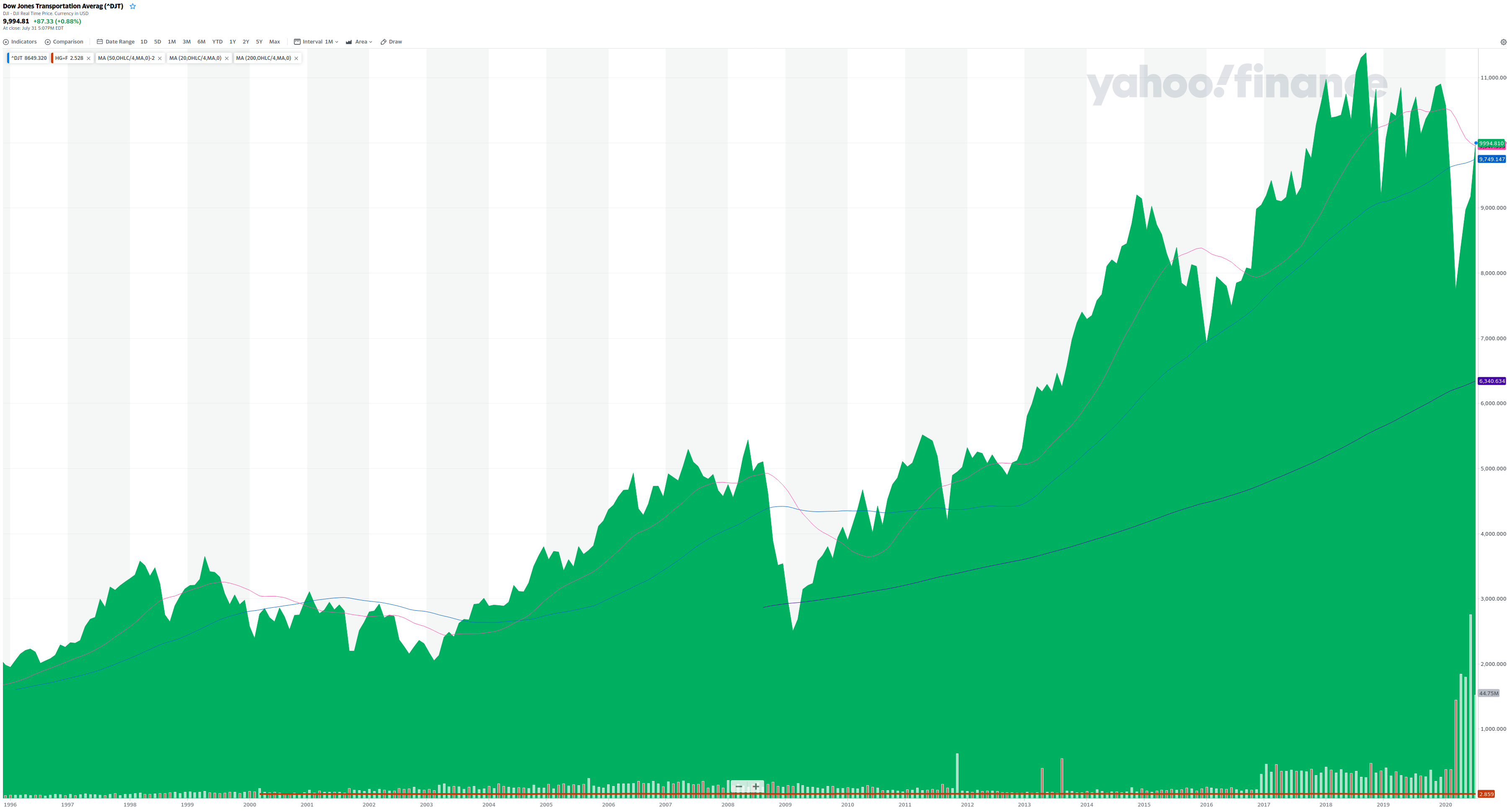 The two Yahoo Finance charts each show the Dow Jones Transportation Average index in combination with copper (reddish brown line) – both are considered to be leading indicators (in contrast to the vast majority of lagging indicators).