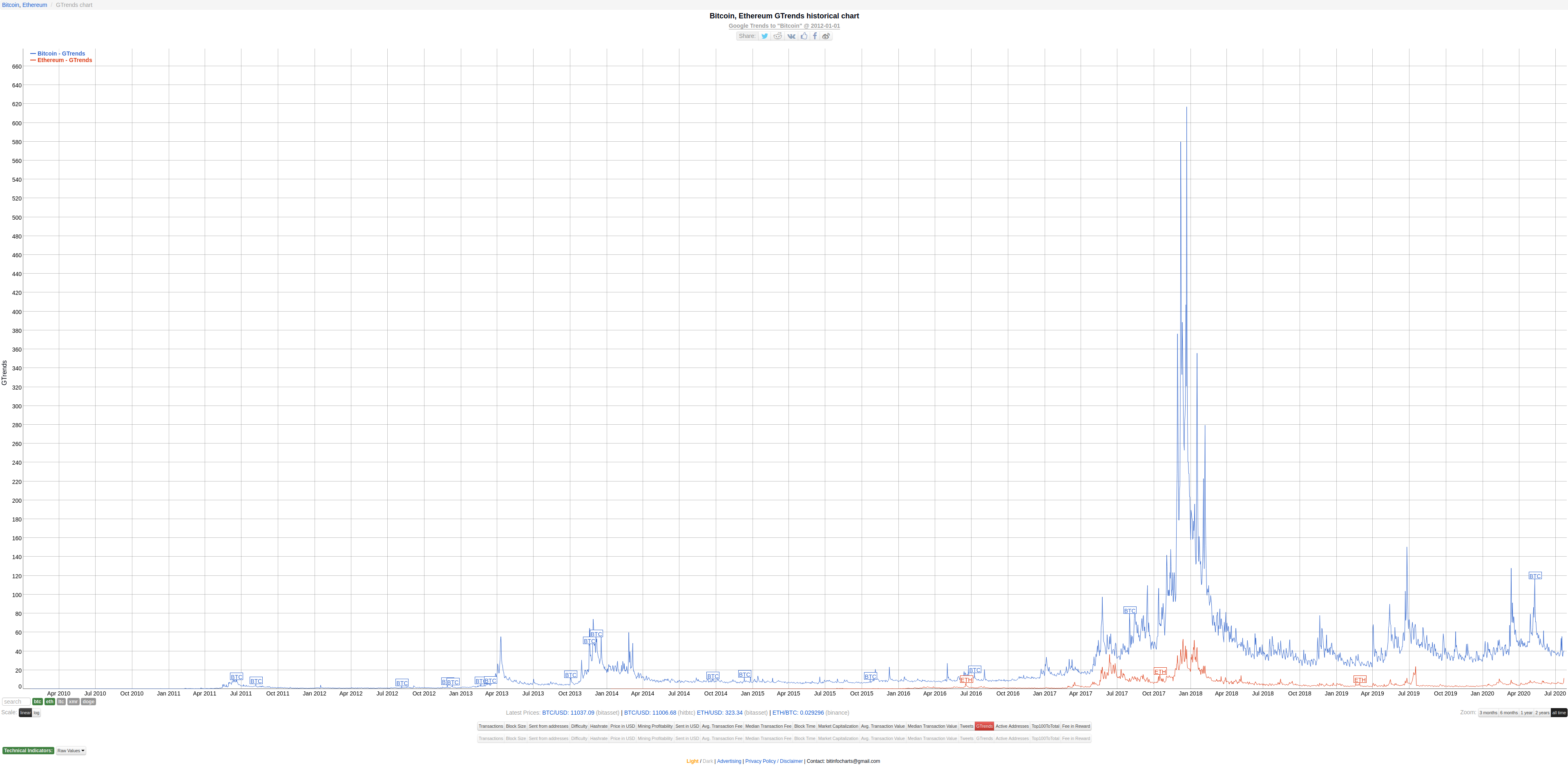 Google Trends for Bitcoin and Ethereum – usually, these trend plots are used in a contrarian way: the greater the public interest, the higher the risk.