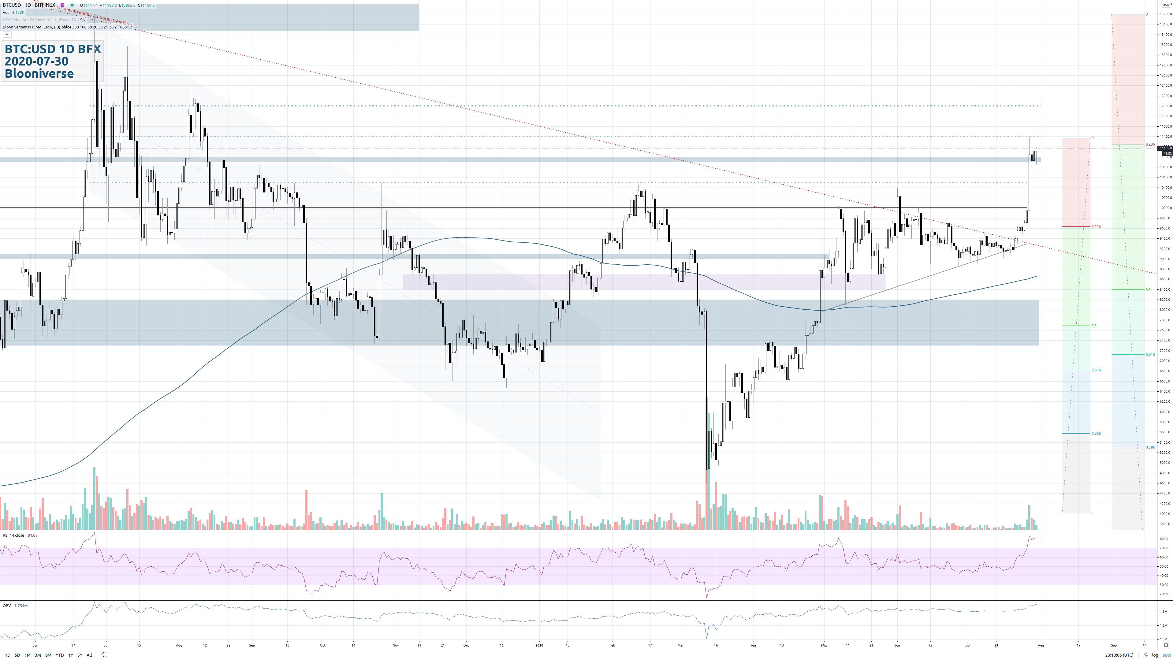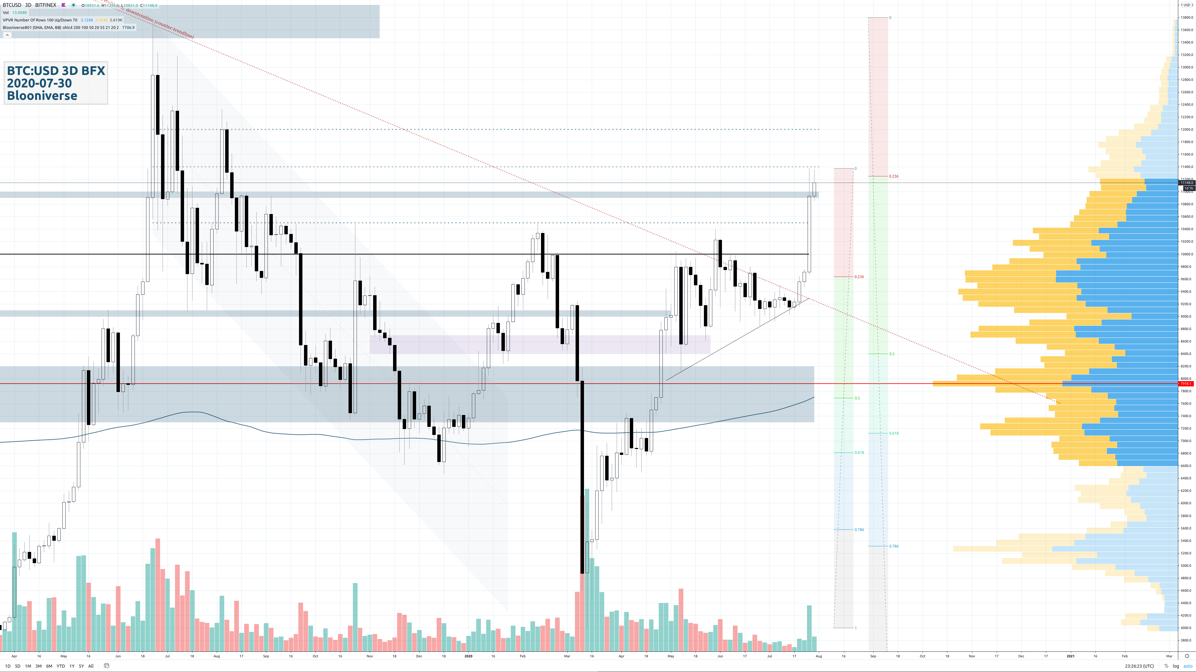 Working chart with volume-profiling (VPVR) since April 2019 and, consequently, a point of control (red line) of roughly USD 7900. The Fibonacci retracement levels (depicted as vertical, multi-coloured bars on the very