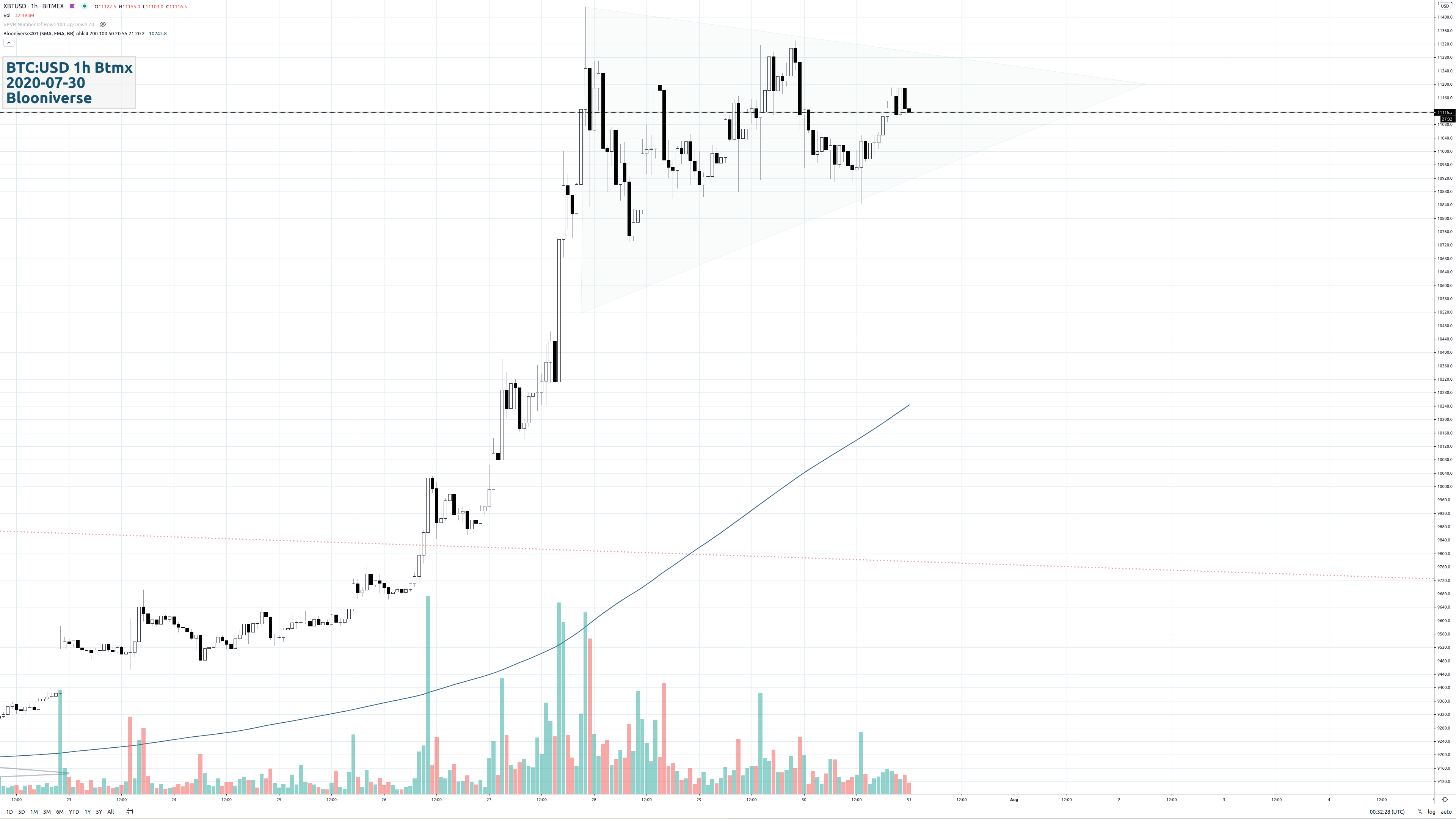 Having zoomed in a bit closer, we can already see the next, most current pattern forming: some form of triangle! Understanding triangles and pennants as continuation patterns, this would be considered as bullish.
