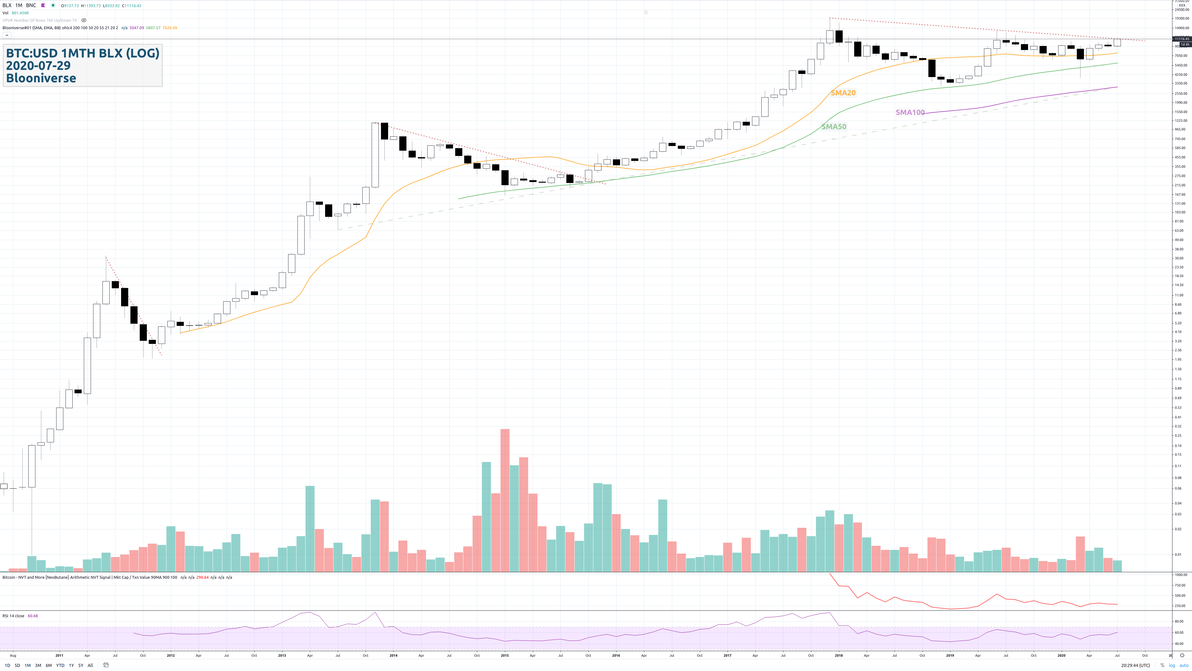 Following moving averages (SMA) are used: 200mth, 50mth and 20mth (monthly timeframe). The first chart's scale is set to logarithmic, the second to linear.